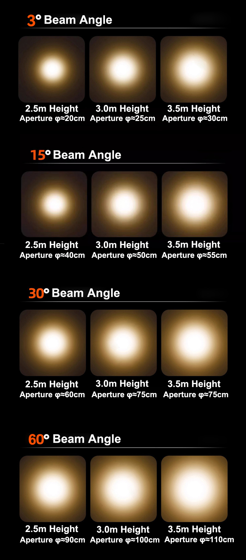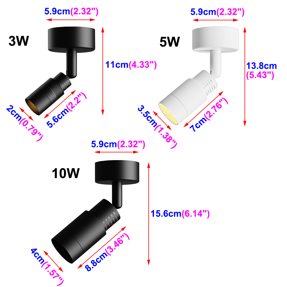 Lamp head: 3W:5.6cm/2.2"x2cm/0.79"; 5W:7cm/2.7"x3.5cm/1.38"; 10W:8.8cm/3.46"x4cm/1.57"; |