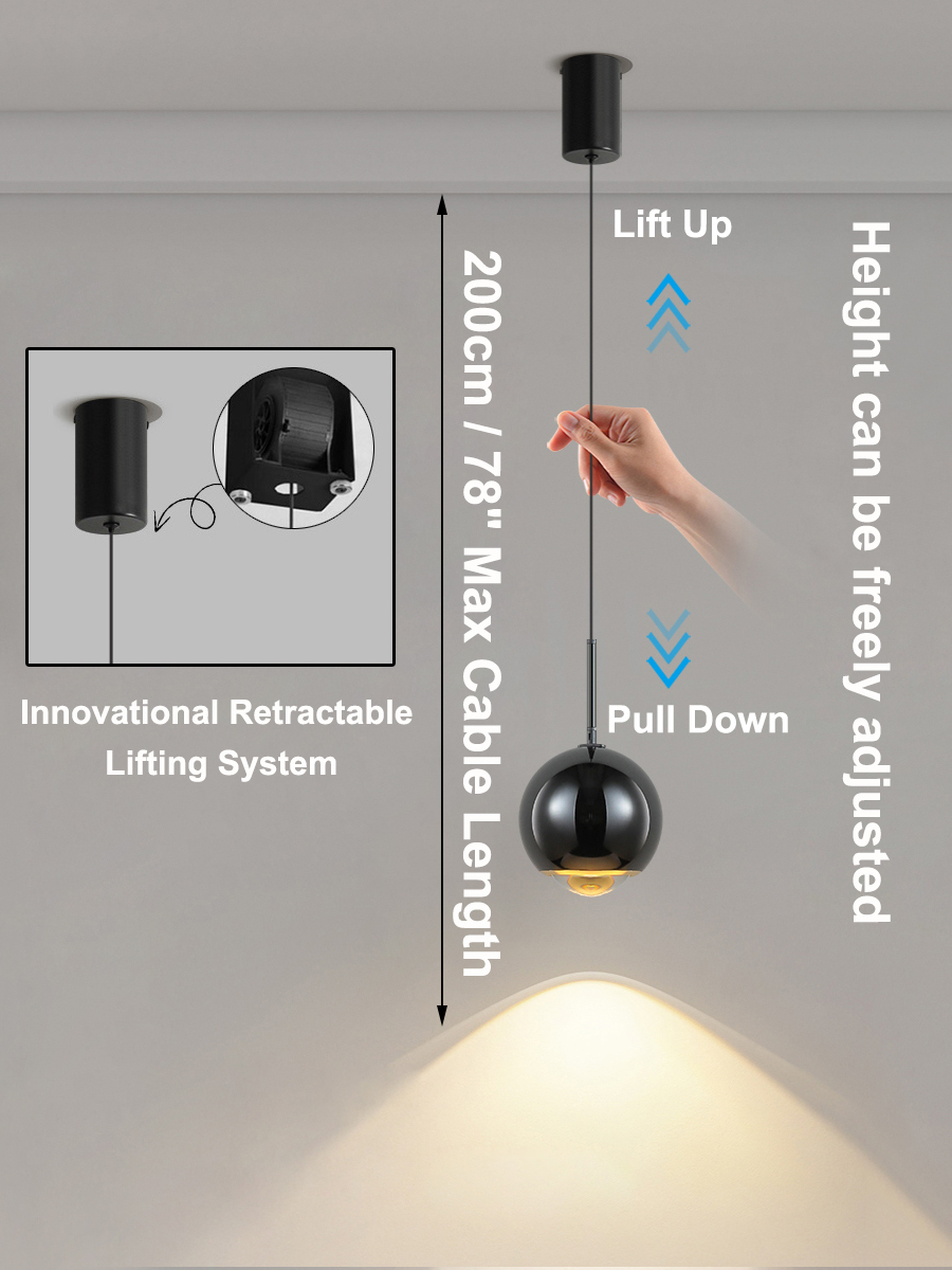 The modern pendant light has a built-in pulley retractable lifting device